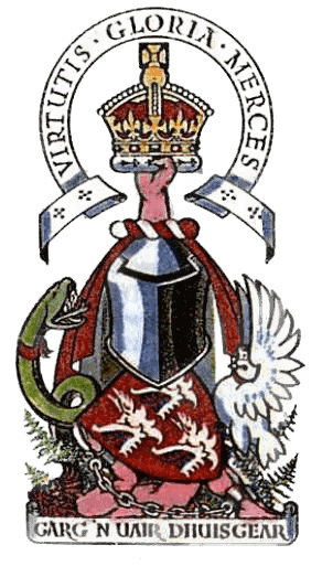 Struan is a member of the Standing Council of Scottish Chiefs. His livery colours are gules (red) and argent (silver) and his coat-of-arms comprises the Shield (gules) emblazoned with three wolves’ heads (argent); the crest – a dexter hand holding up an imperial crown; supporters – on the dexter side, a serpent (vert) and on the sinister, a dove (argent) wearing a baronial cap-of-maintenance (azure); on a compartment below the Shield – which is embellished with bracken (the plant badge of the clan) – a monstrous man chained; and scrolls bearing the Chief’s motto virtutis gloria merces (glory is the reward of valour) and the war-cry of the clan garg’n uair dhuisgear (fierce when roused).